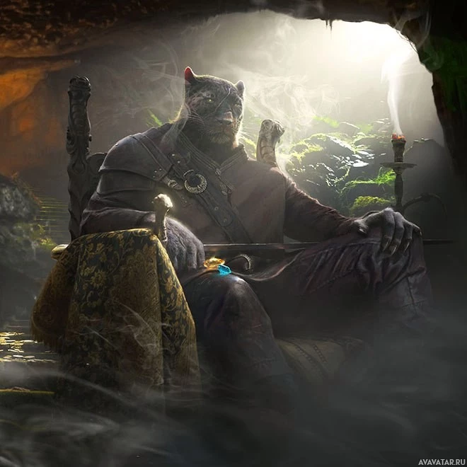 In the image, there is a character who appears to be a khajiit from "The Elder Scrolls"