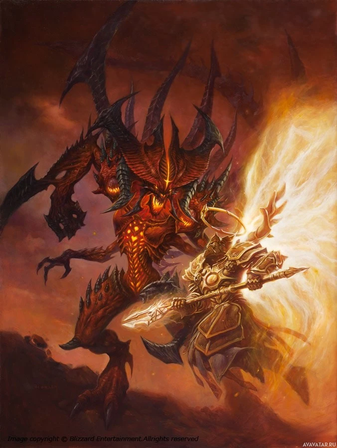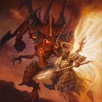 a fantasy scene that is reminiscent of the game "Diablo," which is a popular action role-playing game series. In this artwork, there are two characters: one resembling a demonic creature with horns and