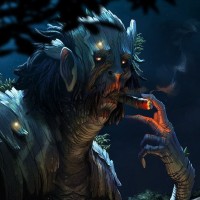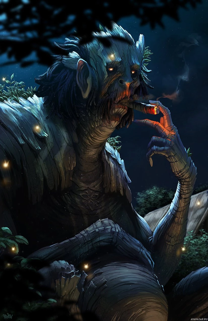 a thoughtful expression. The creature holds what appears to be a cigarette between its fingers, suggesting a human-like habit. This image could be from