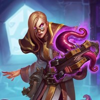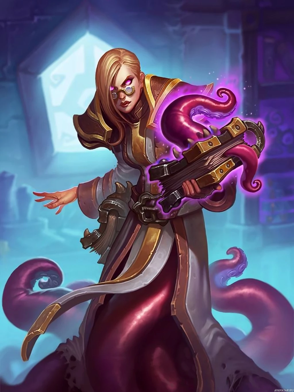 blonde hair and is wearing a white coat adorned with purple accents, along with glasses on her face. In her hands, she holds out a staff that emits