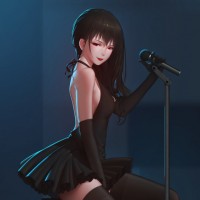 The image features a character that appears to be a female with brunette hair. She is sitting on a stool and holding a microphone, suggesting she might be performing or singing in some context. She is wearing
