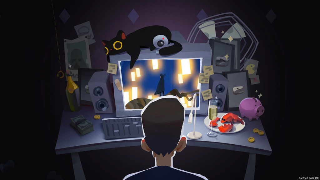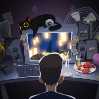 a computer desk, with a cat in front of him. The desk is cluttered with various items such as a cup and some papers. There is also a large screen displaying what appears to be