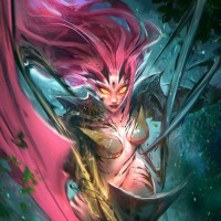 a dynamic pose and a fantastical setting that includes elements like leaves and other natural materials, which are consistent with her abilities within the game.