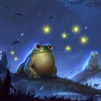 На снимке изображена лягушка, сидящая на земле ночью. На заднем плане есть огни, которые могут быть светлячками или звездами, создавая волшебную или мистическую атмосферу. Это скорее иллюстрация, чем фотография. Сцена спокойная и безмятежная, лягушка смотрит влево, возможно, наблюдая что-то вдалеке.