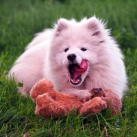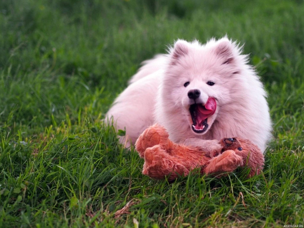a fluffy coat. The dog appears to be playing or chewing on a red stuffed animal, which could be interpreted as a "