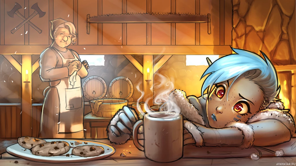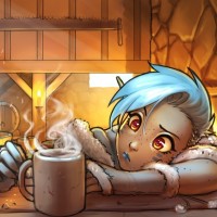 blue hair and is sitting at what appears to be a counter or bar, holding a cup of coffee. There's steam rising from the cup, suggesting it might be hot. In the background, another character is standing behind the counter, wearing a traditional baker or brewer's outfit, with