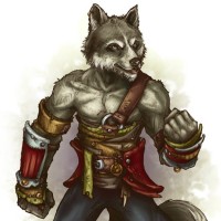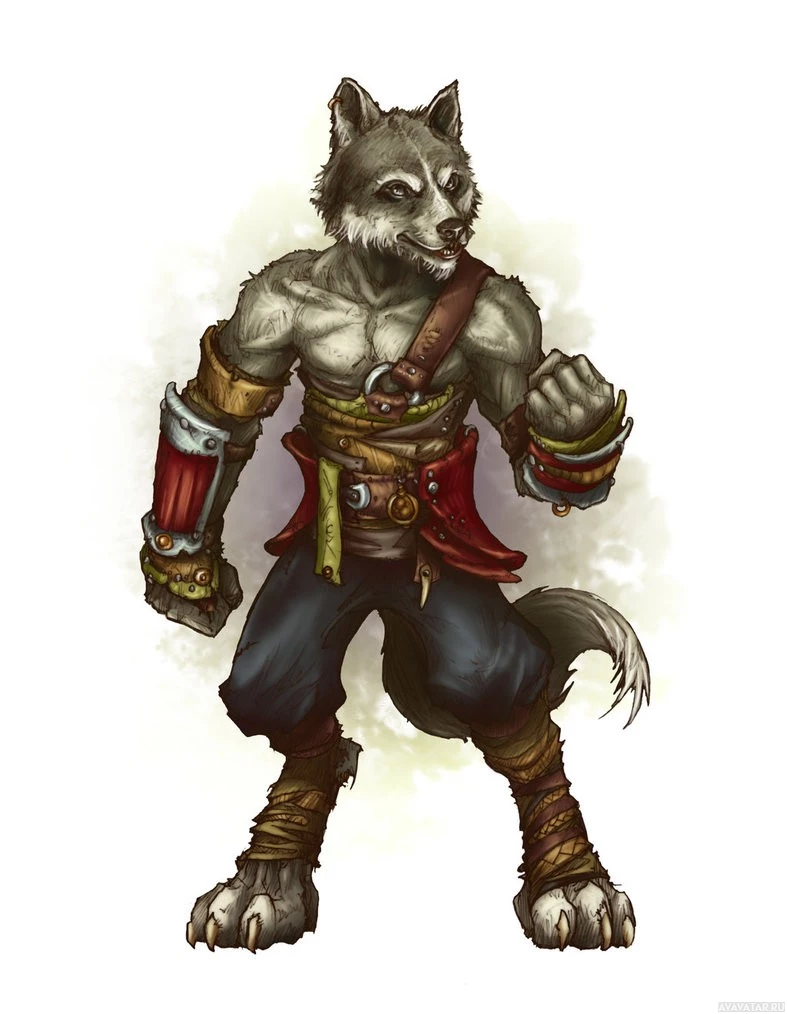 an illustrated character that appears to be a fantasy-style werewolf. The character is anthropomorphic with human features such as arms and hands, standing upright on its