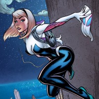 superhero costume, which includes a black bodysuit with white web patterns and spider emblems. Gwen Stacy is standing on a building ledge or wall at night, and the background suggests
