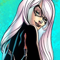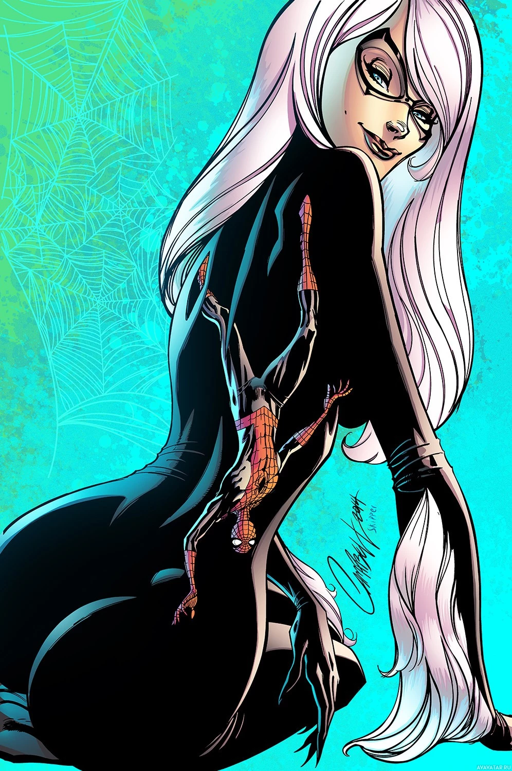 Black Cat," a villain from the Spider-Man comics and movies. She is shown in her iconic costume, which includes a black bodysuit with white spots or designs on it, and she has