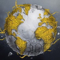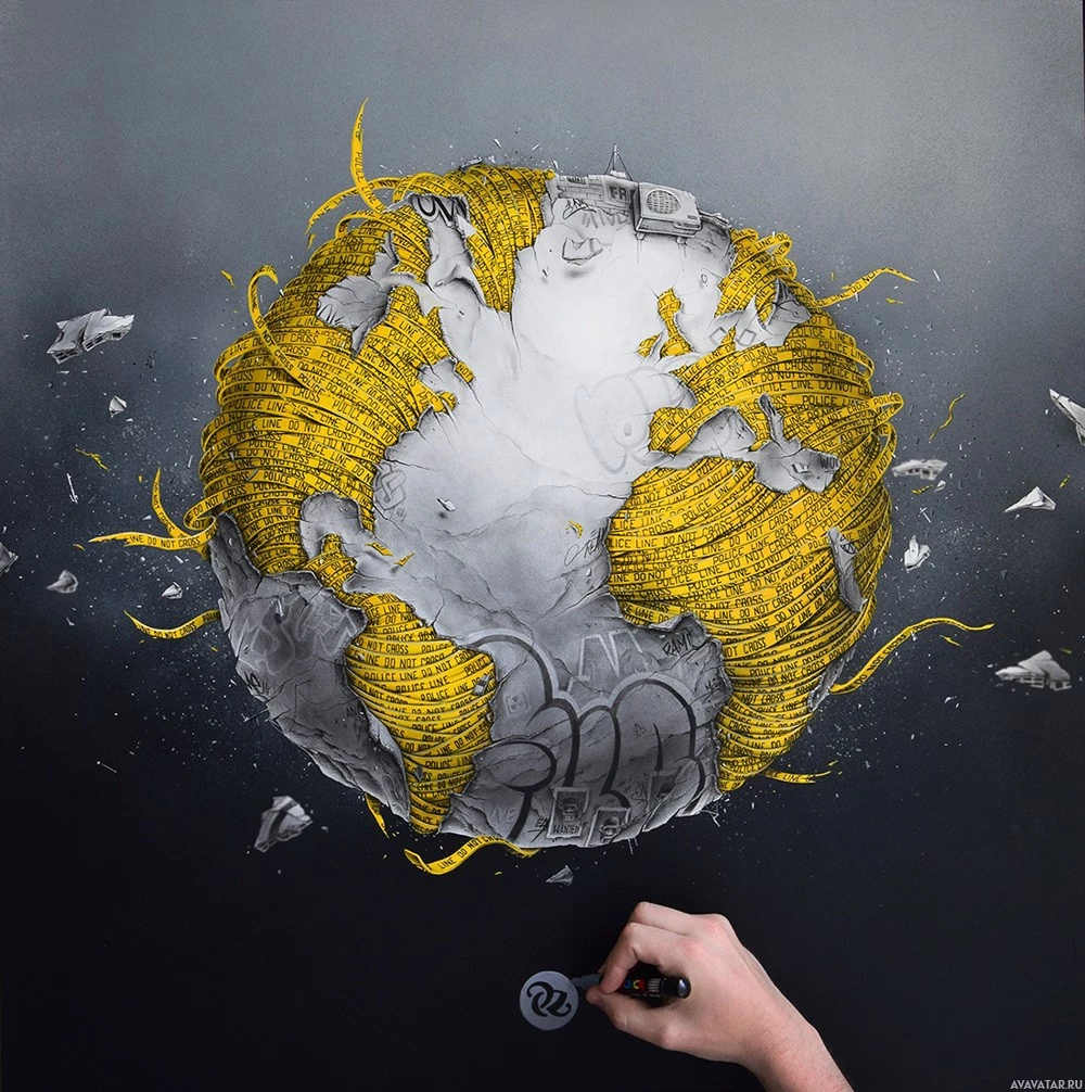 the various shapes and lines that suggest garbage or litter floating around or on the Earth's surface. This artwork might be making a statement about