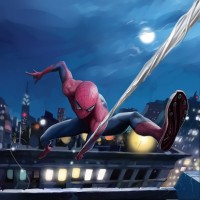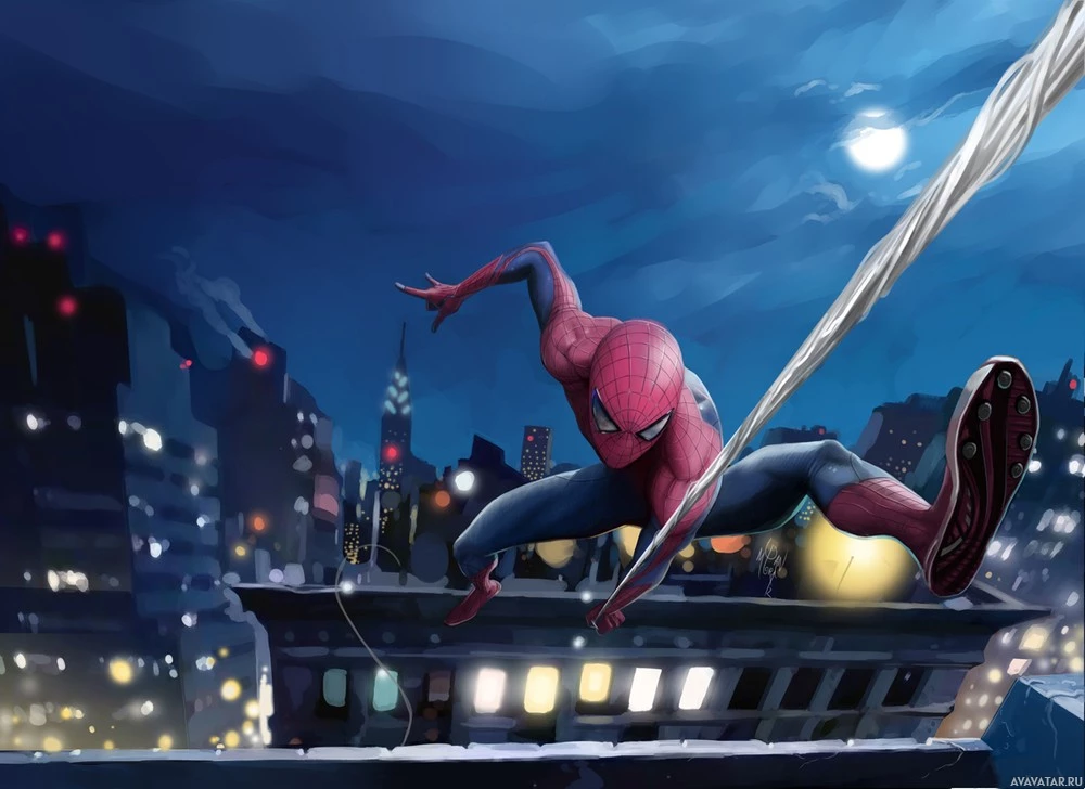 Картинка показывает Человека-паука в его культовой позе. Он сидит в паутине, одной рукой сжимая край здания, на которое он поднимается, а другой рукой, вытянутой наружу, готовой отмахнуться в любой момент. Действие происходит ночью на фоне городского горизонта под полной луной.