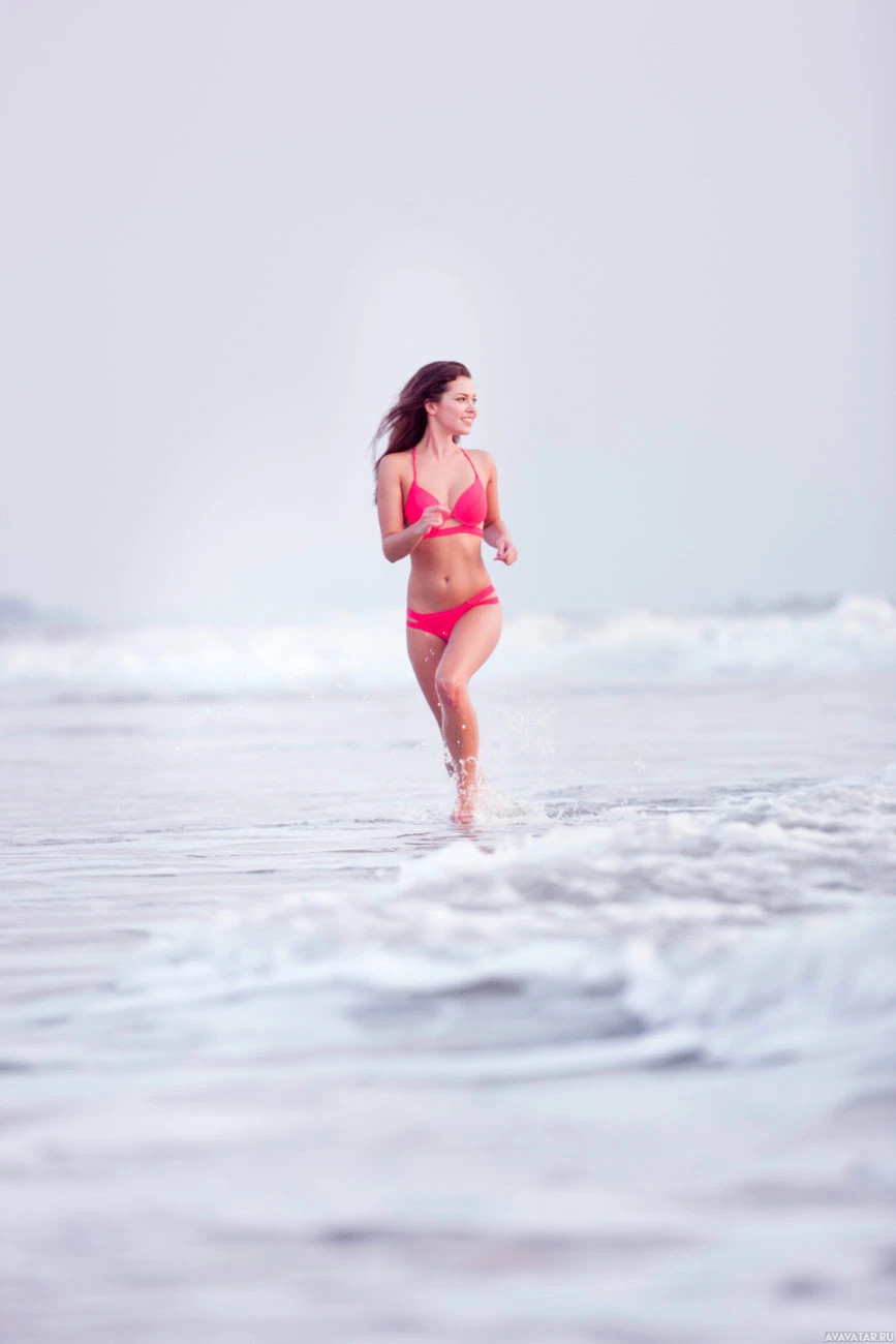In the image, there is a young woman running along a beach near the ocean. She appears to be wearing a bikini top and shorts. The setting seems to be a beautiful day at the seaside with gentle waves lapping against the shore.