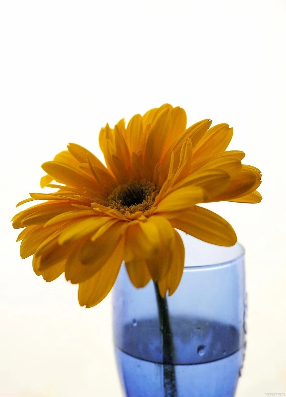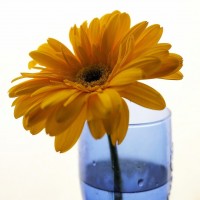 yellow flower, which is likely a type of daisy or similar species, placed in a blue glass vase. The flower has long green stems and several layers of petals that are bright yellow with some