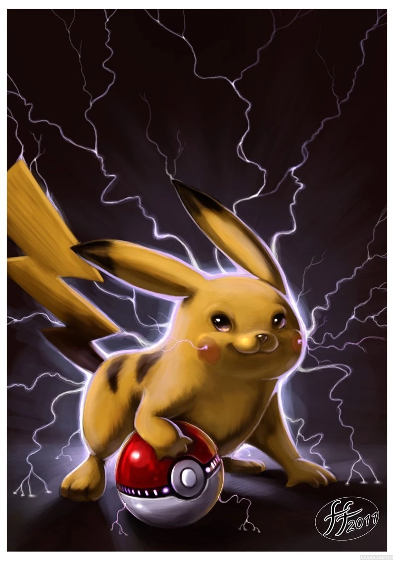 lightning bolts adding to the intensity of the image. Pikachu is holding a red and white Pokeball in one hand, which is a central element of the Pokémon series where these balls are used for capturing and storing Pokémon creatures. The artwork showcases Pikachu's recognizable features with great