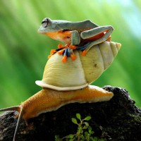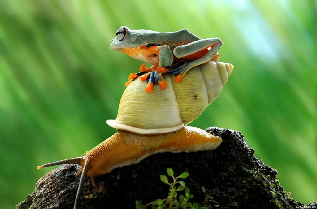 This is an image of a snail carrying a frog on its back. The snail appears to be navigating through