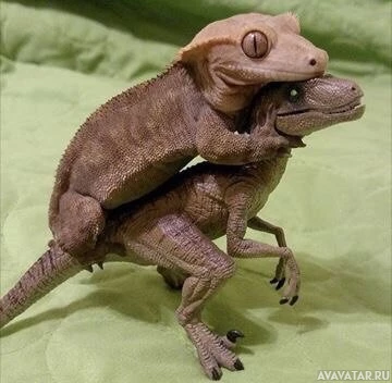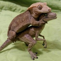 toy figures, one resembling a gecko and the other resembling a dinosaur. The gecko appears to be riding on top of the back of
