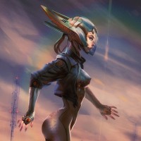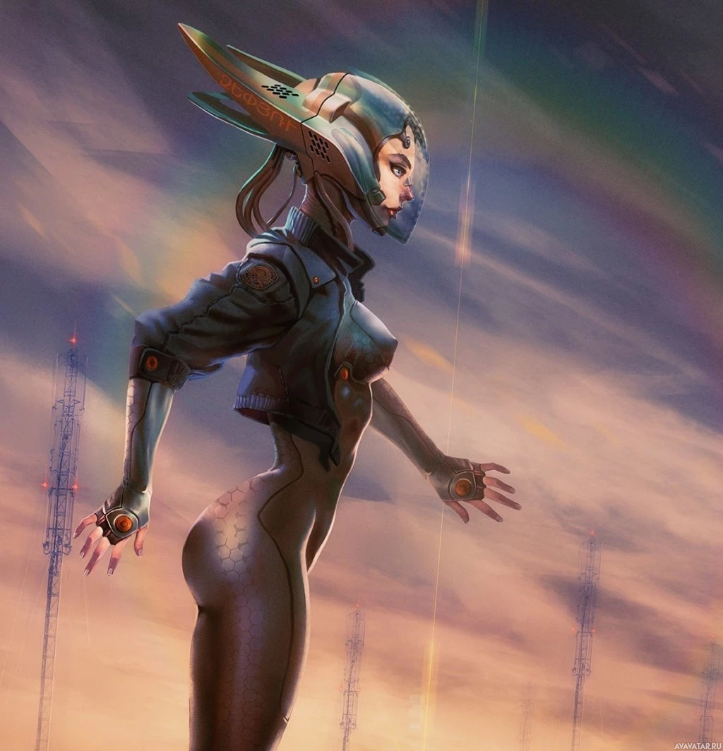 a female character who appears to be part of a science fiction setting. She is dressed in futuristic attire, including what looks like a helmet with antennae and possibly some form of