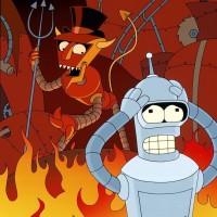 main characters, Bender (the robot on the left) and Fry (the human in the middle), are in a chaotic situation. They appear to be in hell, surrounded by flames and demons, with one demon seemingly taunting them. The background features fiery flames and red horned creatures that add to