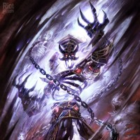 dynamic pose, holding what looks like a magical staff or weapon, and wearing armor with a skull design on it. In the background, there are dark, stormy clouds and swirling energy that gives an impression of chaos or