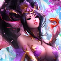 aquatic nature. Her attire suggests she may be a character from fantasy or mythology, dressed in ornate garments with