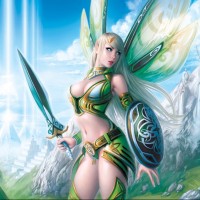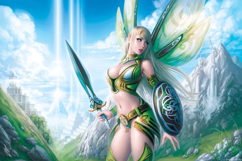 white hair, is holding a sword, and wearing armor that features designs resembling a fairy or elf. Behind her are elements such as rocks, grass, trees, and what appears to be an ancient ruin or tower with a mystical