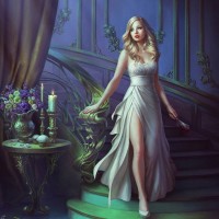 a vase with flowers on a table beside her. The character seems to be posing in a poised manner, possibly for an illustration or as part of a storyline related to fantasy or historical genres.