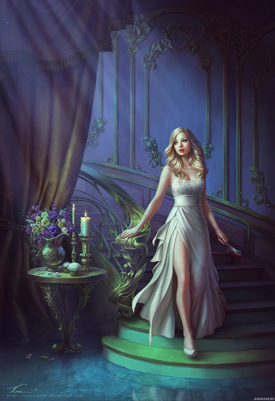 a female character, who appears to be a blonde girl with an elegant dress on. She is standing in a room that has a gothic or Victorian design theme, suggested by the ornate decorations and the overall