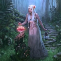 The image depicts a fantasy scene featuring an elf. She has white hair, is wearing a flowing dress, and holds a flower in her hand. The background suggests a mystical forest setting with misty paths and ancient ruins or stones. There's also a light source that seems to be glowing from above, contributing to the ethereal atmosphere of the scene.