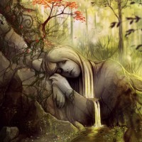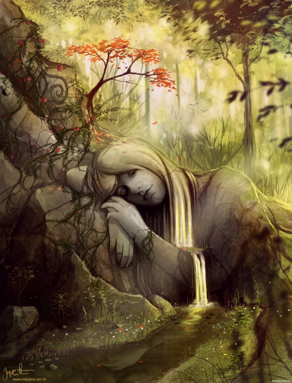 a small waterfall nearby, adding to the serene and peaceful setting. The forest appears dense, suggesting that she might be in a secluded or undisturbed place. The artwork evokes