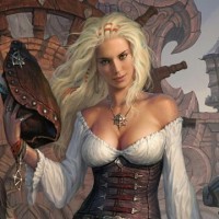 blonde hair and is wearing armor, which includes a corseted top with laces and a skirt, along with boots. In her left hand, she holds what appears to be