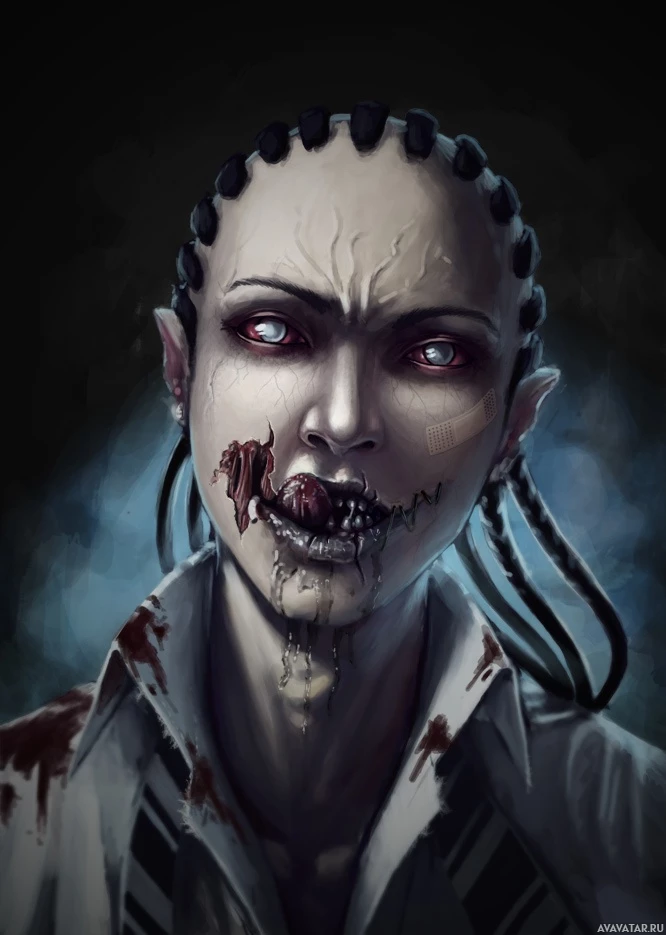 The image depicts a character that appears to be in a state of horror or zombie-like condition. This person has