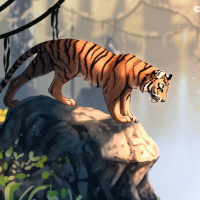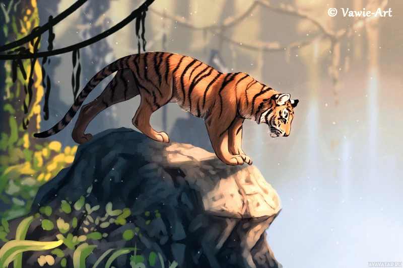 На картинке изображен тигр, стоящий на скалистом обнажении с густой растительностью и туманным пейзажем на заднем плане. Сцена безмятежна, и кажется, что это анимационный фильм или цифровое произведение искусства, учитывая уровень детализации и стилизованный внешний вид.