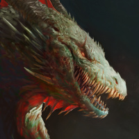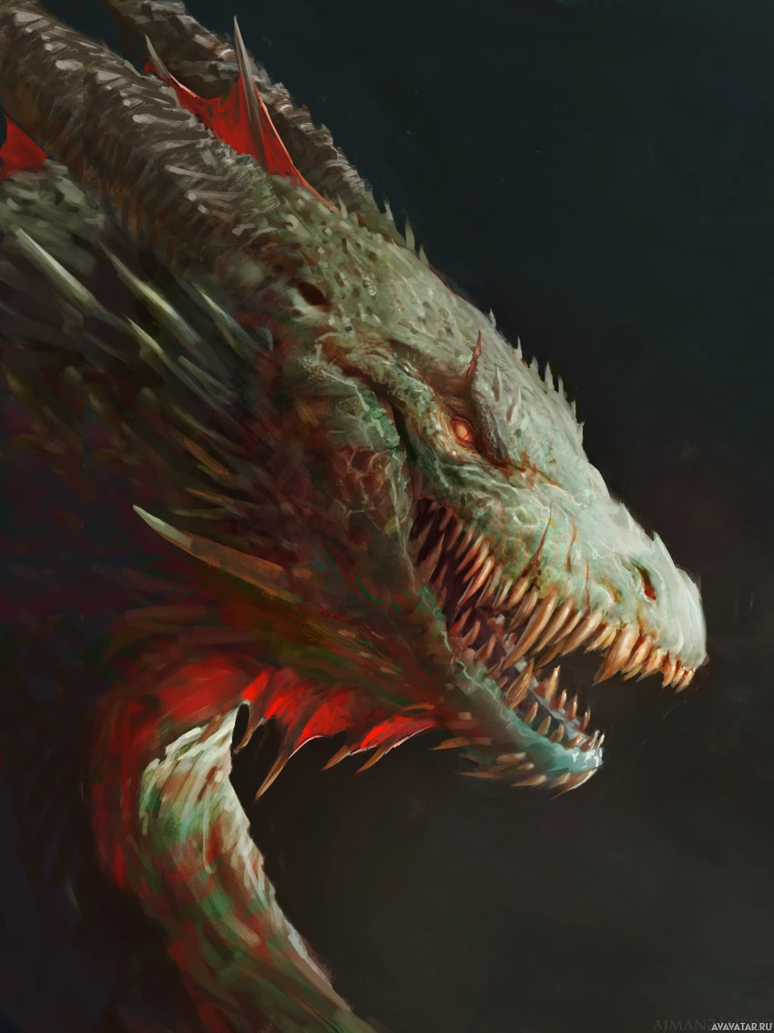 sharp teeth, scales, and wings, giving it an intense appearance. The dragon is shown against a dark background, which contrasts its