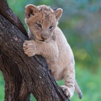The picture features a young lion cub clinging to a tree branch. It appears to be in an outdoor setting, likely in the wild or a natural environment that mimics their natural habitat.