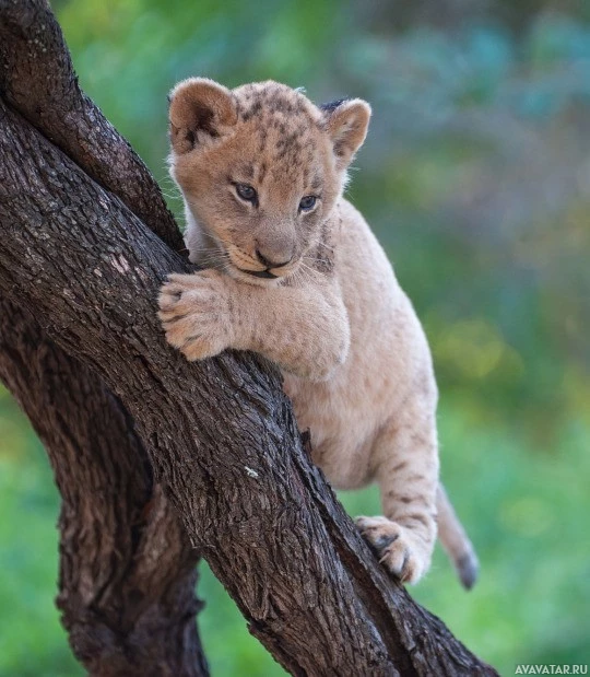 На картине изображен молодой львенок, цепляющийся за ветку дерева. Похоже, что он находится на открытом воздухе, вероятно, в дикой природе или в естественной среде, которая имитирует их естественную среду обитания.