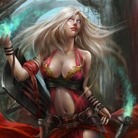 fantasy character. She is a blonde, and she appears to be in a magical or mystical setting, possibly