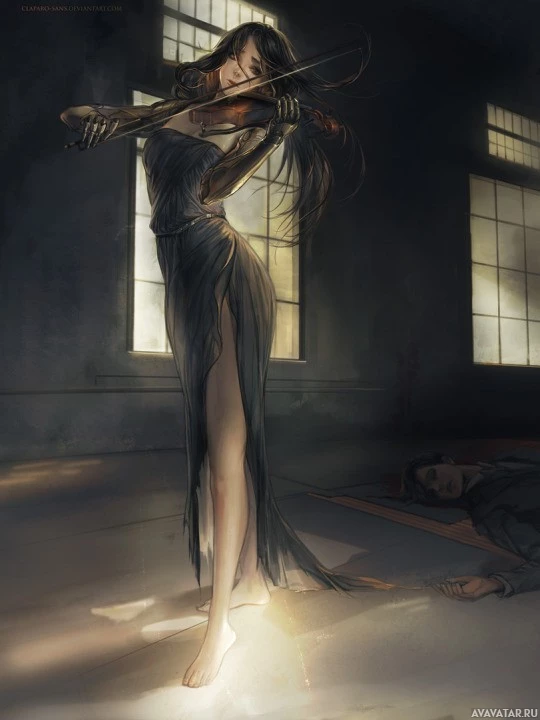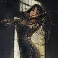 a female character playing the violin. She is dressed in classical attire reminiscent of ancient Greek or Roman clothing, with long flowing hair that contrasts with her serious