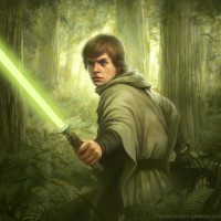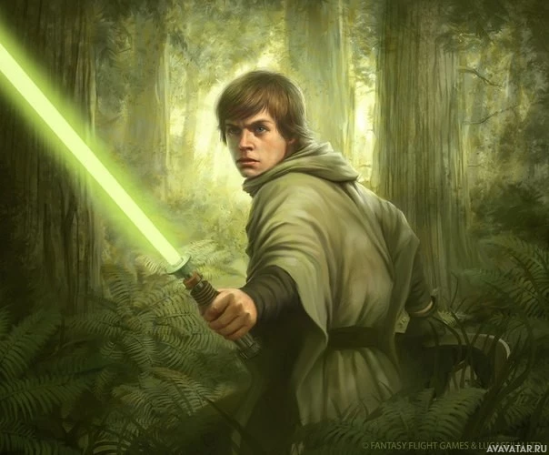 the Star Wars franchise, specifically Luke Skywalker as portrayed by actor Mark Hamill in the movies. He is holding a lightsaber and standing amidst