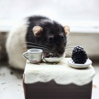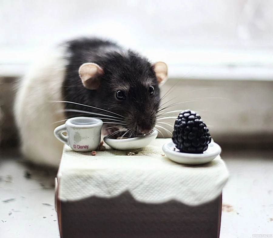 food items and dishes that are placed in front of it. There's a cup, likely containing coffee or tea, to one side, and there appears to be a dish with a berry-like object, which might be a blackberry or similar fruit. To the left of the rat is