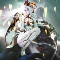 white hair and what appears to be magical or mystical elements. She is riding on the back of