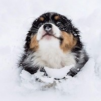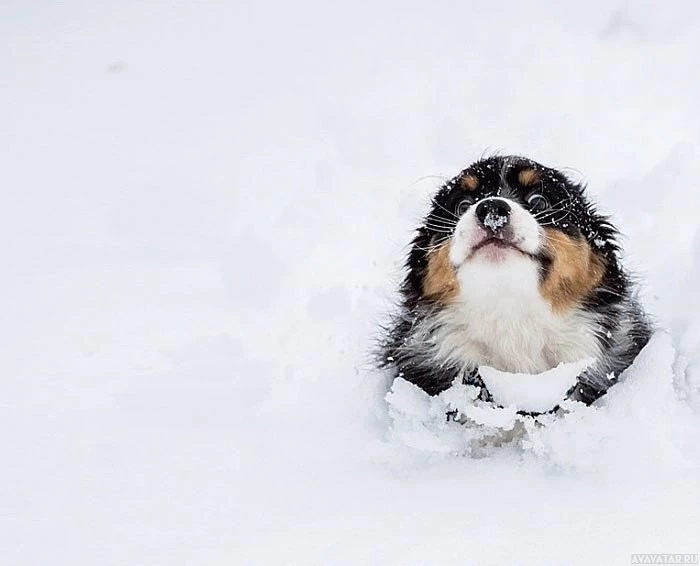 a playful pose surrounded by snow. The dog appears to be enjoying