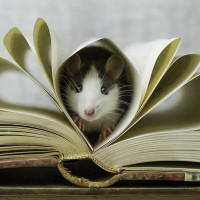 open book. The book is propped up and the pages are spread out as if being read by a larger creature. The background of the image is plain and does not provide any additional context about the setting.