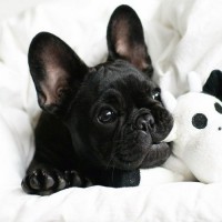 a stuffed animal that resembles another French Bulldog. Both the dog and