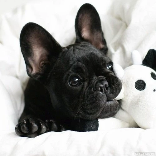 a small dog, which is likely a French Bulldog based on its distinctive features. The dog appears to be laying down and resting its head on its paw. Next to the dog, there is