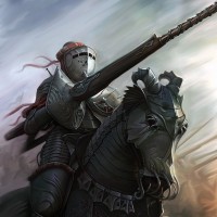 На картинке изображен воин, едущий верхом, держащий копье, как будто готовый к бою. Воин носит доспехи и, кажется, является частью исторической или фантастической сцены, возможно, в средневековом или мифическом контексте.