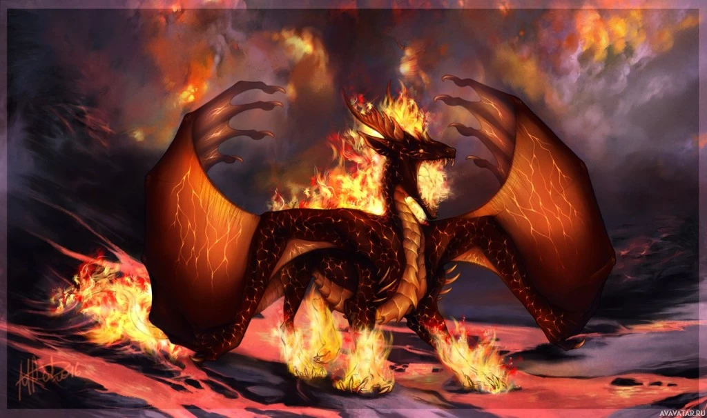 large wings and flames flickering around its body, suggesting it is either in the act of breathing fire or surrounded by an elemental force such as fire. The dragon is set against