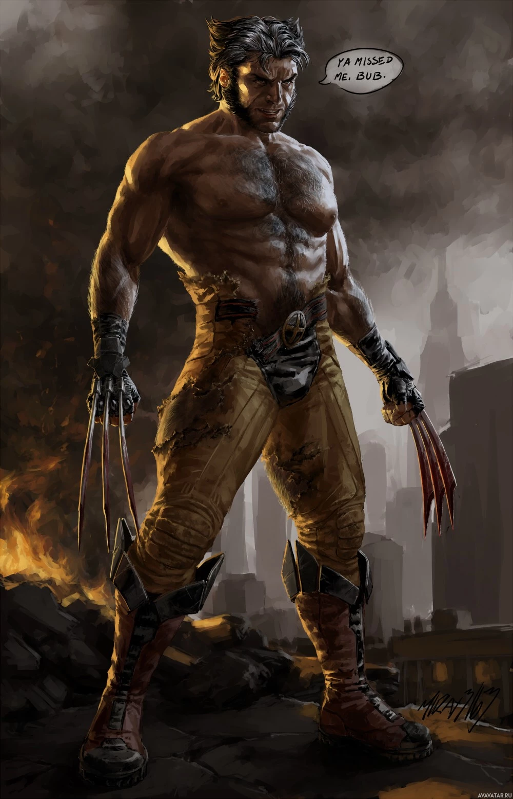 a chaotic scene with explosions and debris, indicating a battle or conflict setting. The character's appearance resembles that of the X-Men comic