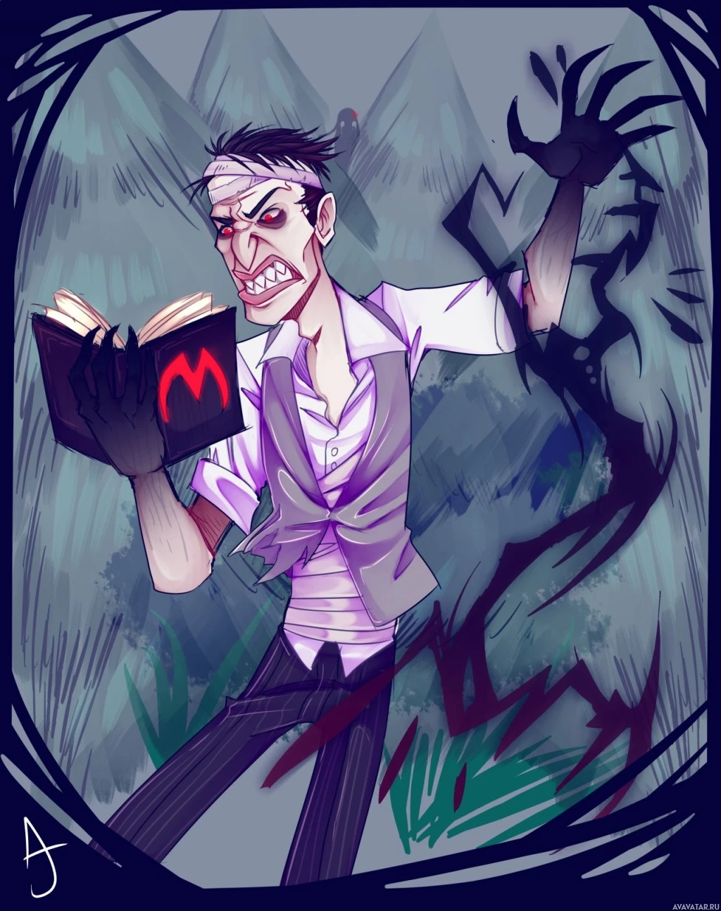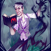 a mad scientist or inventor, as indicated by the book he is holding and the crazed expression on his face. He has