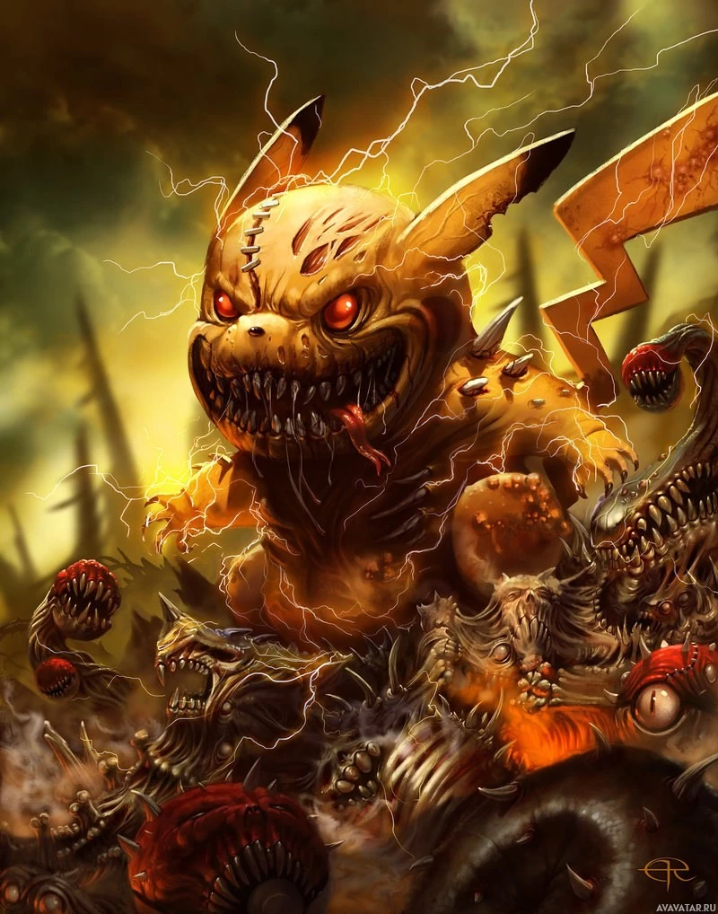 version of Pikachu from the Pokémon franchise. In this artwork, Pikachu's face has been altered to appear menacing with