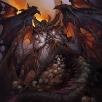 a fantastical creature, often associated with a demonic or mythical theme. It has multiple sets of wings and horns, with
